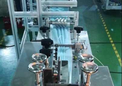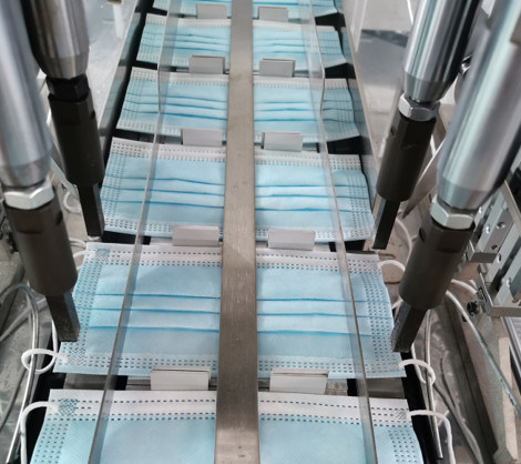 After the body machine makes the mask body, it is output through a small belt and then automatically sent to the earloop welding machine. The earloop welding machine automatically cuts the earloop and welds it to the mask body through the principle of ultrasonic waves, and manufactures the finished outlet mask, which is collected by the receiving conveyor belt.